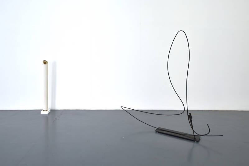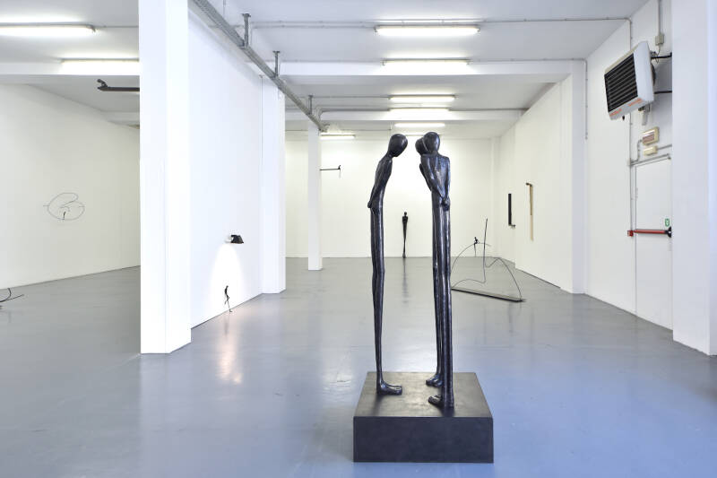 Il senso di non-appartenenza si legge anche nelle composizioni scultoree di Alex Pinna in ferro e bronzo: le figure anonime sembrano dei doodle senza volto e senza sesso, come se fossero il riflesso specchiato di una società di nomadi dove si è ovunque e in nessun luogo allo stesso tempo. L’artista le allunga fino a renderle quasi trasparenti, impercettibili: un altro esplicito richiamo al senso di solitudine che si prova quando si è soffocati dalla folla.