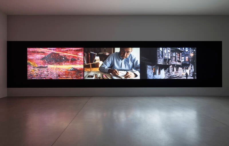 Il girato esposto presso la Galleria Francesca Minini di Milano è la tripartizione di un unico filmato che a detta dell’artista conta più di duecento ore di lavoro, dall’inizio del progetto all’incirca nel Dicembre del 2021. Nello scorrere delle immagini sugli schermi si percepisce l’interazione e il dialogo silente tra due creatori di storie: stratificazioni, asincronie e rimandi, proprio come fa lo scrittore cesellando e cancellando, sono elementi che Kazma sottolinea attraverso l’obiettivo, in modo che l’esperienza del pubblico non sia un assorbimento passivo, ma che lo spettatore stesso diventi protagonista attivo. Non è l’obiettivo della presa a inquadrare i manoscritti di Pamuk, ma i nostri stessi occhi,