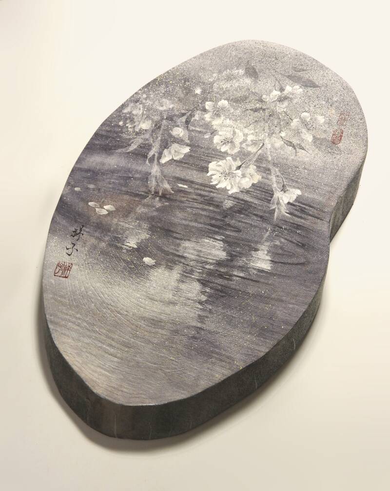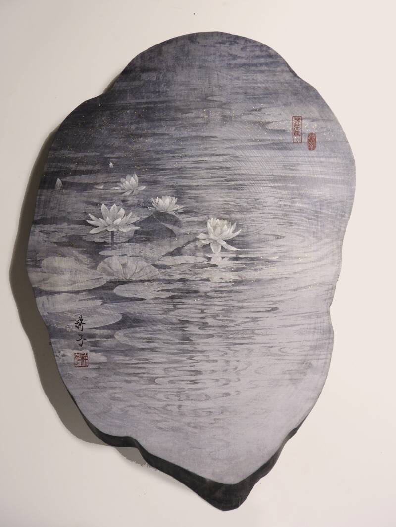 Per la sua sottigliezza, è possibile scorgere ancora i cerchi concentrici che segnano l’anima del legno e la centralità è un aspetto che Okumura mantiene vivo nelle opere esposte. Dal cuore del legno si irradia il ritratto di paesaggi effimeri, fittizi, che richiamano una dimensione di un luogo ameno, puro e incontaminato in cui il tempo scorre in pace e armonia con la natura che abita lo spazio, come ninfee e increspature di rivoli d’acqua.
