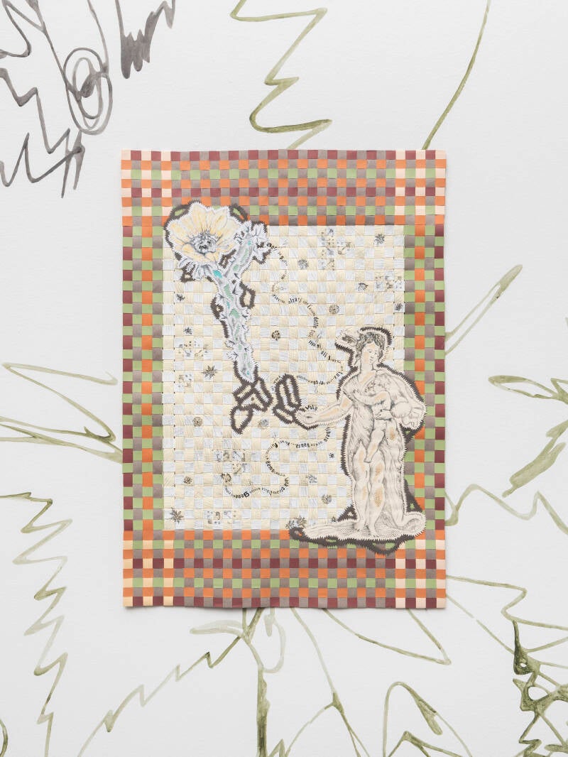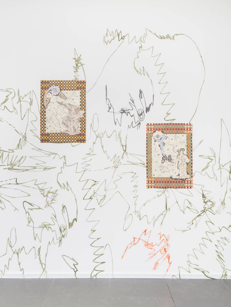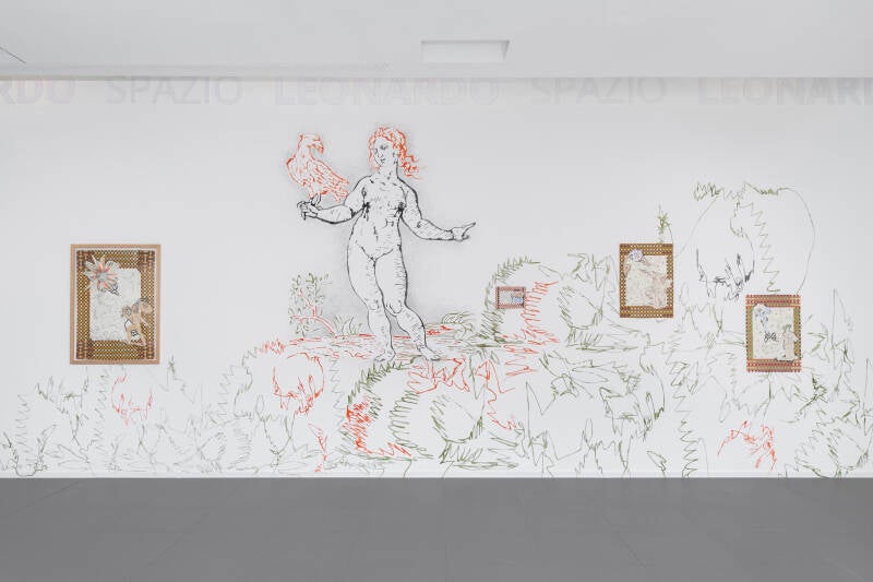 “Il wall drawing, quindi, appare come una pagina senza tempo e fa da sfondo a disegni in carta che appaiono come finestre pop-up da cui scorgere immagini di mondi perduti o ancora da esplorare, ma dentro i quali si intravedono forme compiute ed iconografie note.”