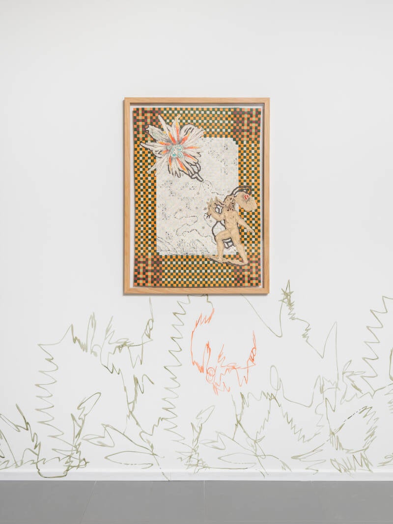 Si cambia prospettiva e si cambia la percezione dell’ambiente circostante, mettendo piede in una dimensione dove il tempo sembra essersi fermato. Il pubblico viene accolto da un wall painting che appare come la mappa fantastica di un mondo sconosciuto, una terra ancora vergine tutta da scoprire. Il tratto è caratterizzato da un segno scattante, nervoso come i disegni di bambini che stanno ancora prendendo confidenza con le proprie mani e che stanno familiarizzando con il processo psicologico per cui le immagini dalla mente e dagli occhi si può proiettare grazie ai gesti del corpo.