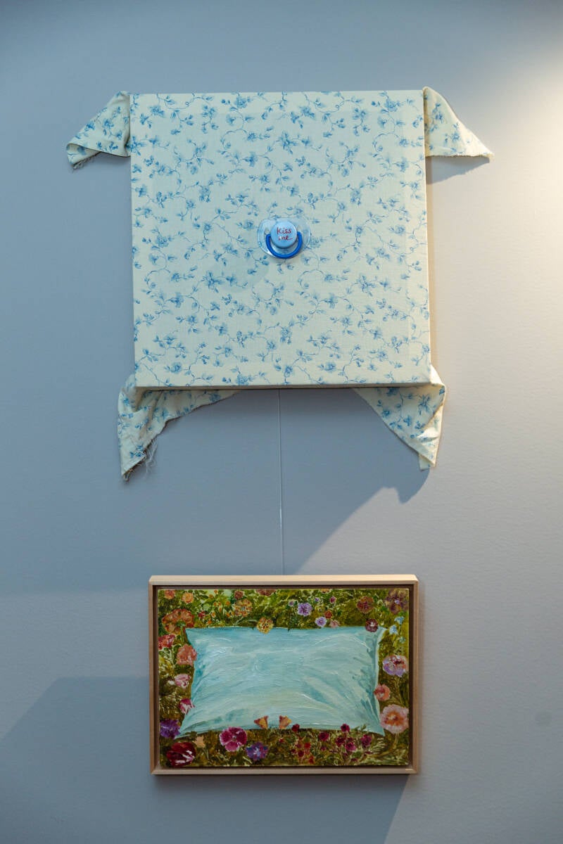 La vibrazione di femminilità è viva e presente nelle opere degli artisti e delle artiste che continuano il percorso espositivo di 1 a 1 Affinità. Tra queste si colloca Maddalena Tesser che presenta un’opera a metà strada tra la traccia erotica di Zanella e Nocentini e la dolcezza del rifugiarsi nel ricordo che si vede nelle opere di Carolina Pozzi. In questo caso, Tesser presenta al pubblico una composizione pittorica che richiama le gigantografie di oggetti del pittore Domenico Gnoli, ma a essere l’oggetto centrale in Tesser è il corpo femminile. La carica sessuale è presente implicitamente in elementi che non nascono come simboli erotici, come i guanti neri, i capelli sciolti e i seni turgidi; il tutto in contrasto con i colori delicati, dalle tonalità pastello.