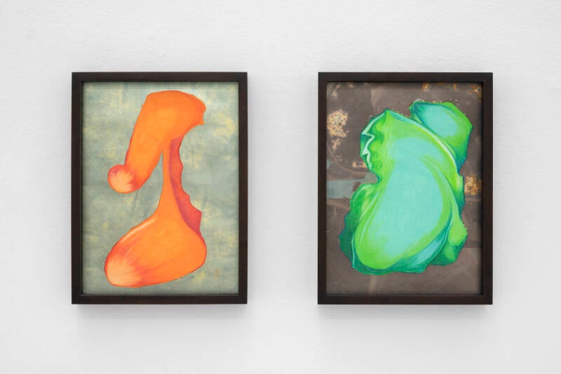Giovanni Kronenberg, Senza titolo, 2023, matite colorate, foglia di metallo ossidata su carta, 31,7 x 24 cm (sinistra); Giovanni Kronenberg, Senza titolo, 2023, Matite colorate, foglia di metallo ossidata su carta, 31,7x24 cm (destra). Courtesy l’artista e Renata Fabbri, Milano. Foto: Mattia Mognetti.