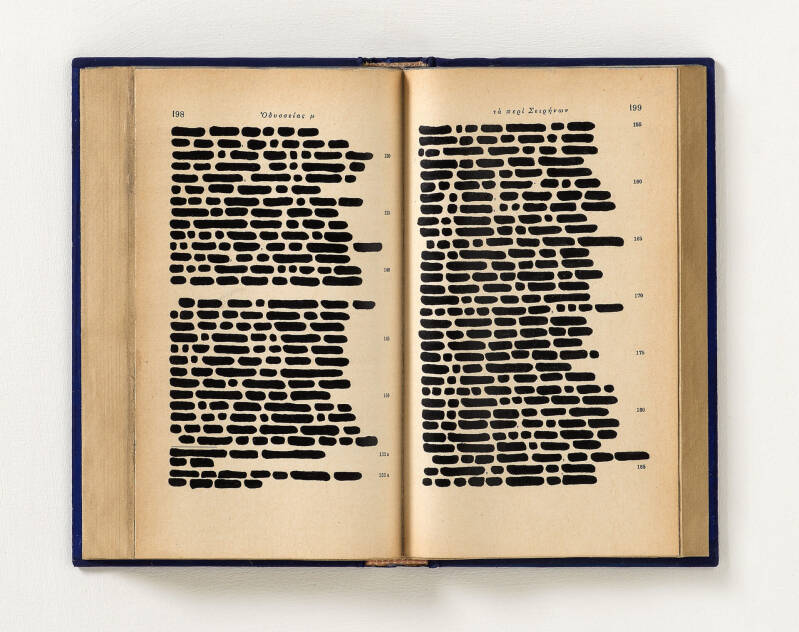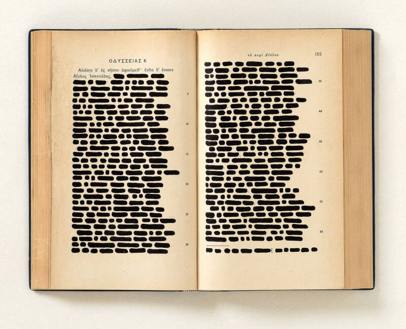 Emilio Isgrò, Odysseia, 1968, (particolare) Opera composta da 8 elementi indivisibili, China su libro tipografico in box di legno e plexiglass, 57 x 67 cm, courtesy Archivio Emilio Isgrò