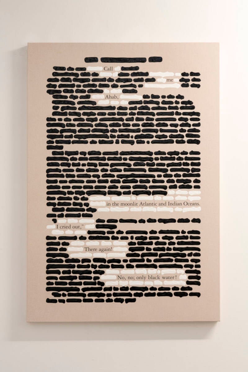 Ma il viaggio non finisce qui. In fondo alla stanza, tre piedistalli sorreggono i testi di Dante, Joyce e Melville, dialogando con le frasi tratte da Moby Dick che si dipanano sulle pareti circostanti. È un'esperienza multisensoriale, dove la parola e l'immagine si fondono per creare un racconto che va oltre i confini del tempo e dello spazio.