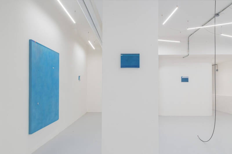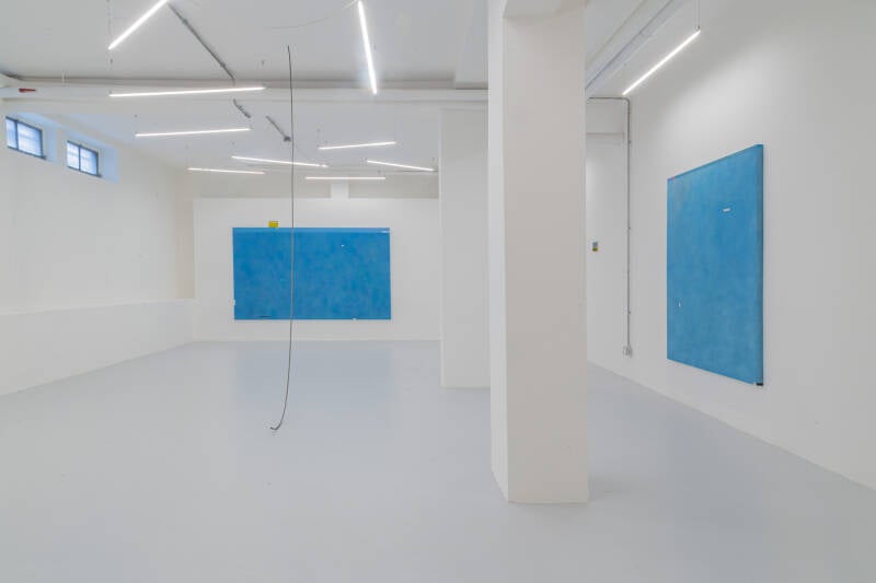 La linea può assumere diverse nature e finalità. Può interagire con gli ostacoli presenti nello spazio o ignorarli, sfruttando la vastità degli spazi tra gli elementi scenografici. Può essere progettata per occultare la complessità dei suoi movimenti o per metterli in mostra, concentrandosi su aspetti specifici e sulla loro esecuzione tecnica. Linee e punti isolati sono i protagonisti delle ampie tele minimaliste di Silva esposte da Banquet: lo spazio della sala principale si trasforma in un’atmosfera celeste, in cui l’occhio del pubblico è come un satellite che guarda a distanza di centinaia di chilometri le lande e le acque. Lo spettatore fluttua nella distanza infinita racchiusa in uno spazio finito e reale.