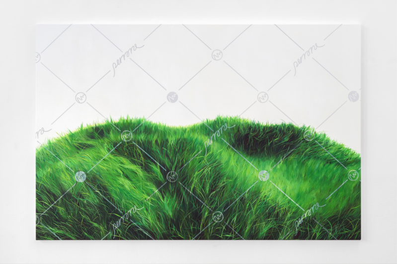 Tuttavia, un elemento disturbante interviene sulla pulizia delle tele: il watermark, una filigrana dipinta che porta il cognome dell'artista. Questo motivo grafico, di solito usato per garantire l'originalità di un'opera, rivendica ironicamente l'appropriazione dell'immagine da parte di Perrone, ribadendo il valore concettuale del suo lavoro. In questa mostra, il watermark non è solo presente sulle opere stesse, ma viene isolato e riproposto sul pavimento dello spazio espositivo, richiamando ancor più l'attenzione sull'uso da parte dell'artista di elementi grafici nel suo lavoro. Questo segno distintivo funge da ponte tra il mondo virtuale e quello tangibile della realtà circostante, irriproducibile.