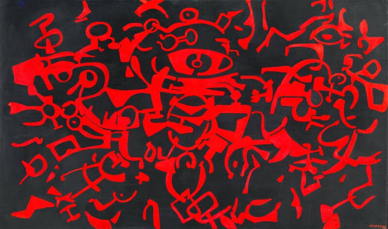 Assedio rosso n. 3, 1956, tempera alla caseina e smalto su tela, cm 97 x 162. Collezione privata, Firenze. Courtesy Tornabuoni Arte