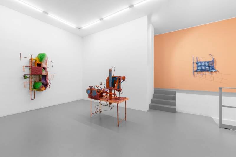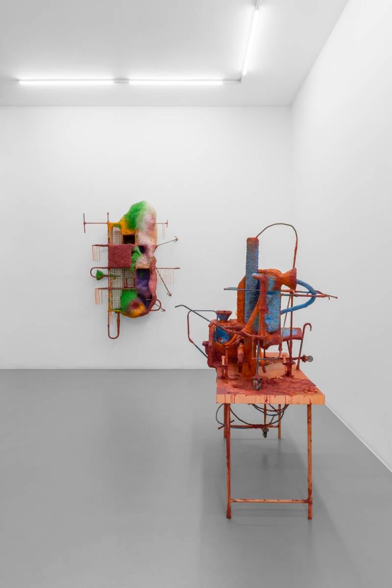 Olivia Bax, Litmus, 2024, steel, chieckn wire, plywood, aluminium wire, epoxy clay, plaster, paper, PVA, household paint, cm 105x57x46