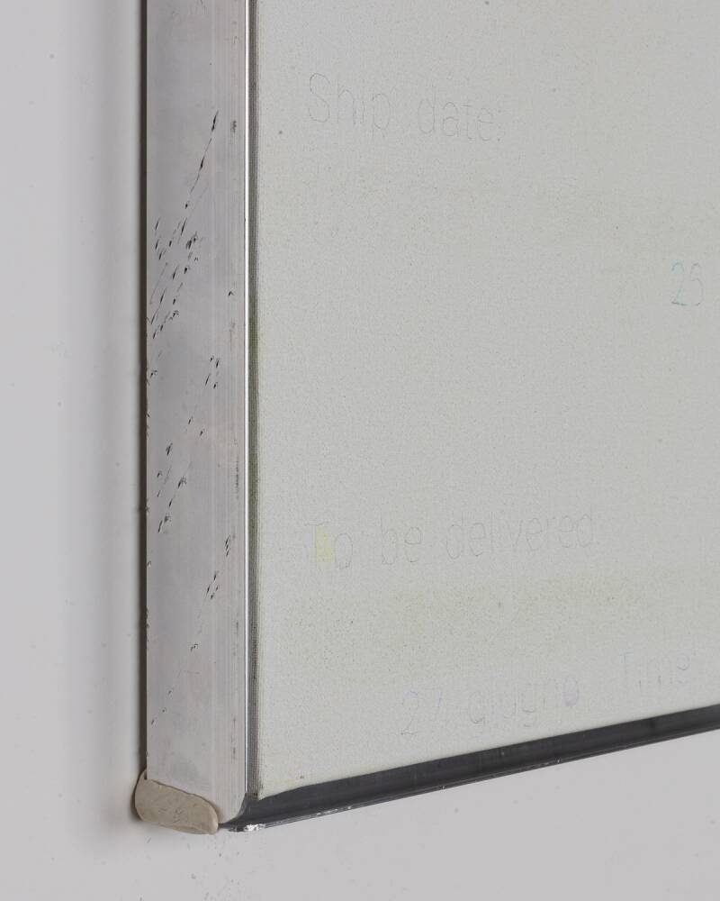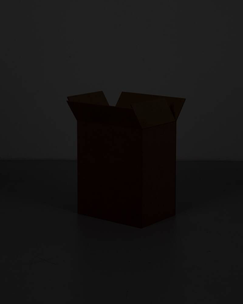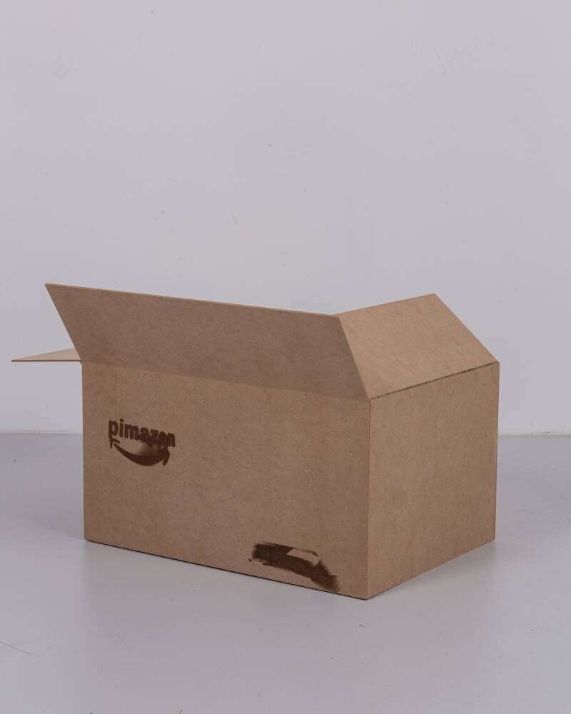 In un certo senso, Carlo Zanni ci mette nella condizione di fare una specie di unboxing morale, quando scendiamo al piano inferiore della mostra, in uno scantinato in penombra dove emergono le sculture della serie DAN. Realizzate in MDF inciso al laser, queste opere reinterpretano i loghi di Amazon distorcendoli, alterandoli attraverso un processo che impiega una versione preliminare e imperfetta di DALL-E, il software di Intelligenza Artificiale per la generazione di immagini.