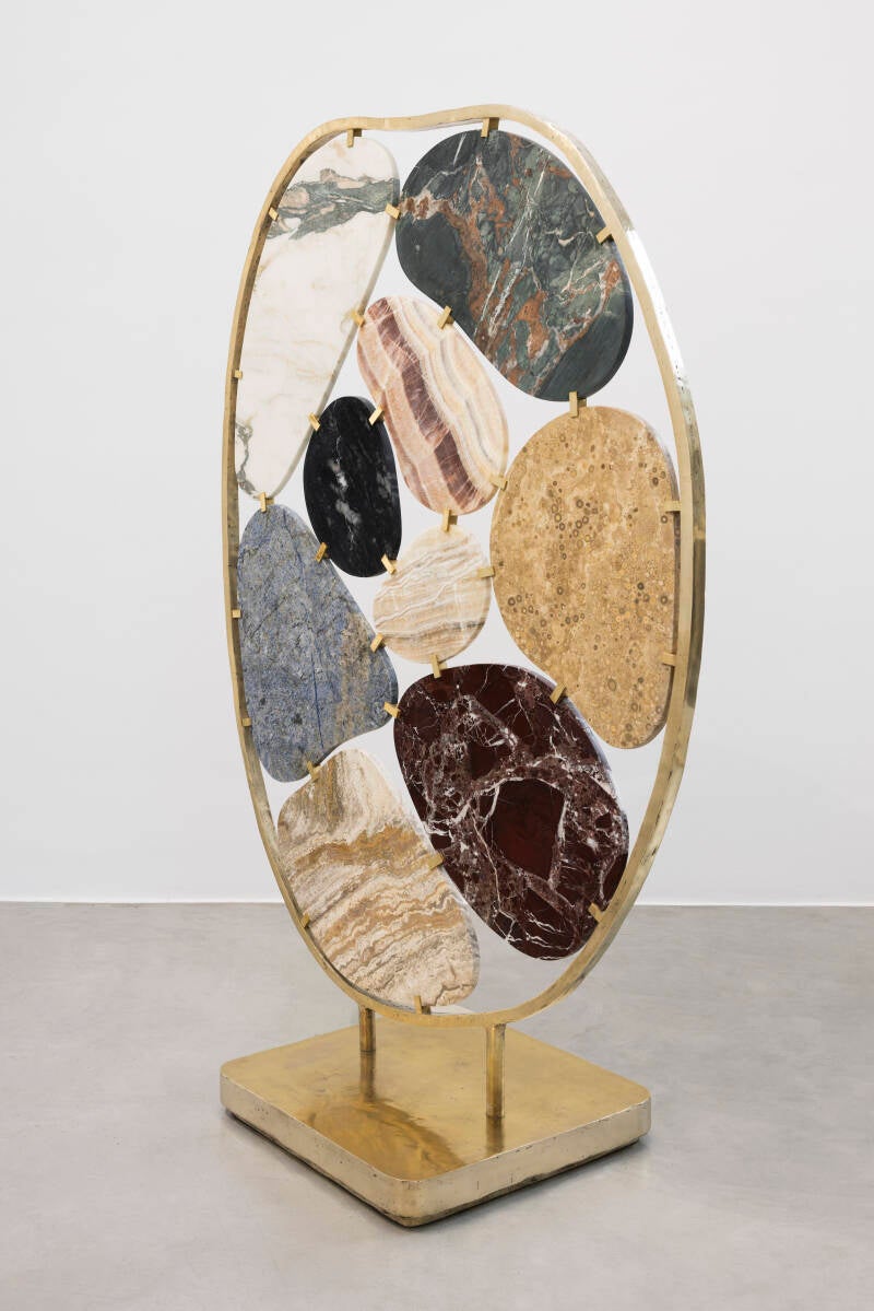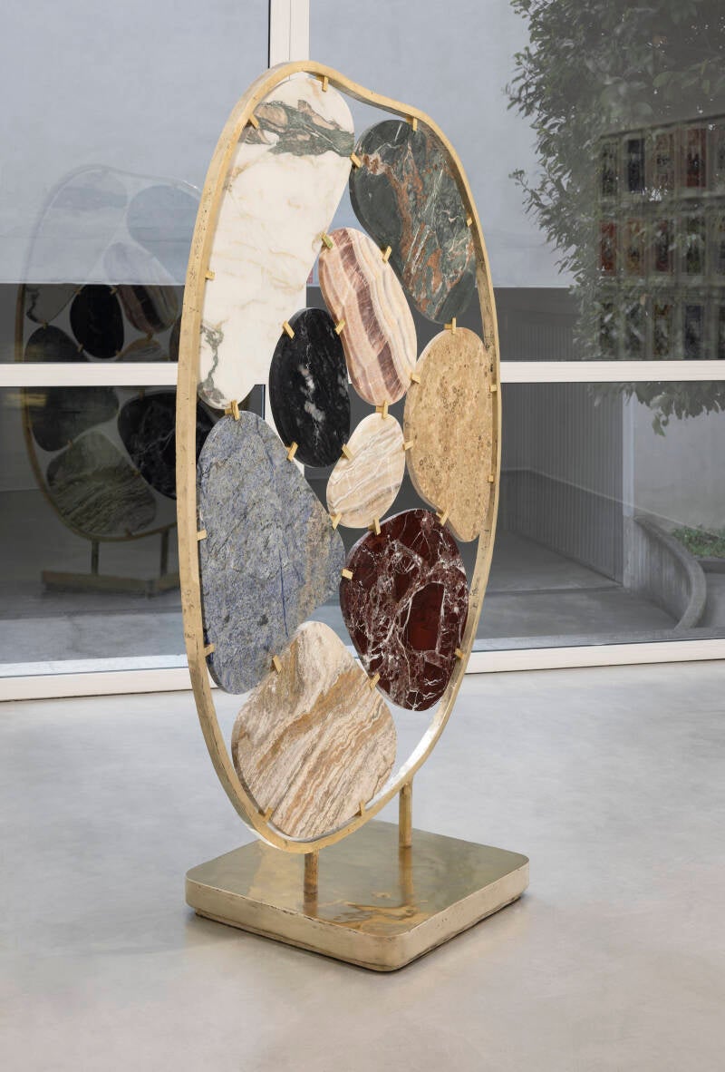 Elena Damiani, Mineral Cell III, 2024, Cast bronze frame, stone slabs (marble, travertine, quartzite, granite), brass fittings, cast bronze base, 192×127×59,5 cm