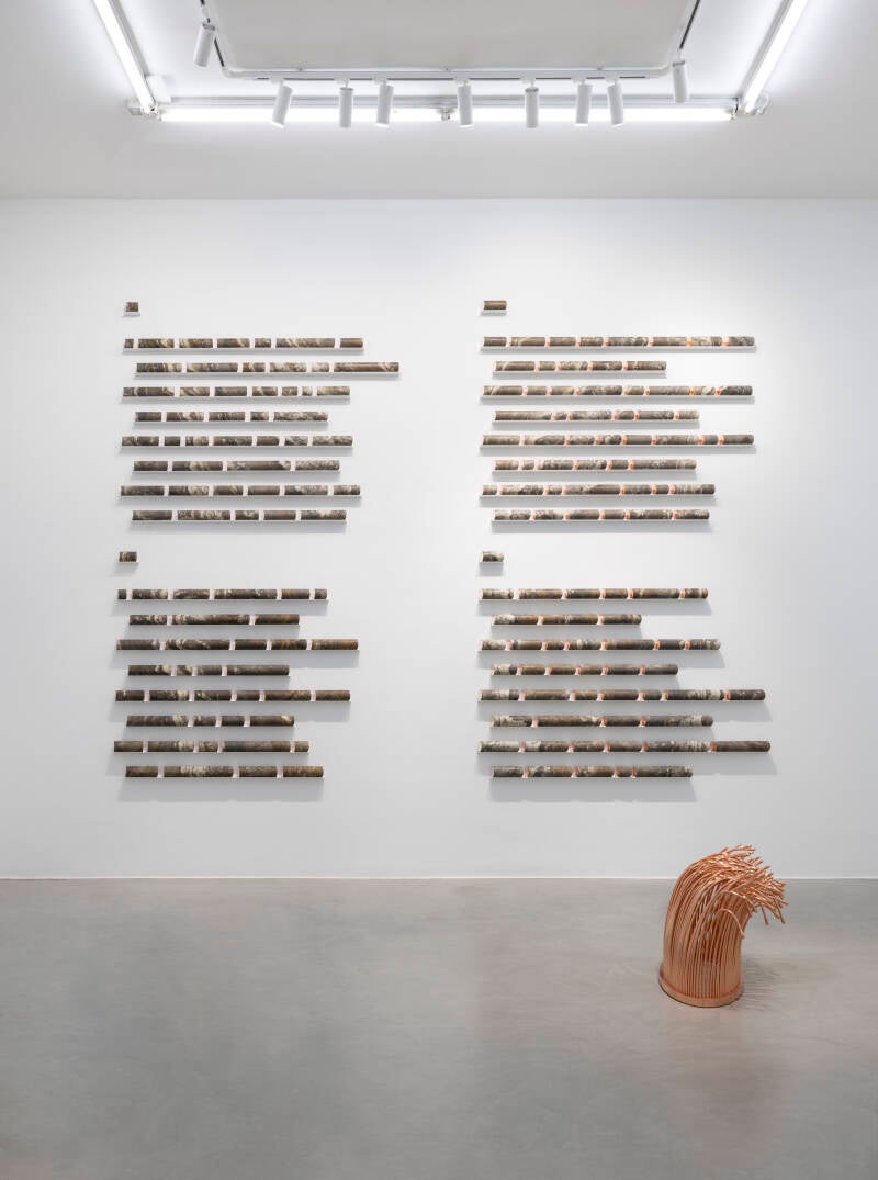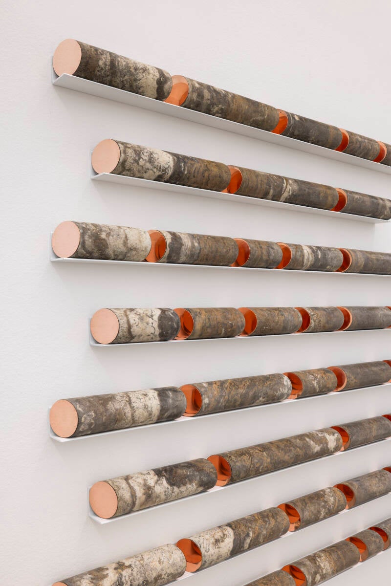 Elena Damiani, Poem, 2024, Travertine cylinders with copper, steel shelves, 260×335×6 cm - detail