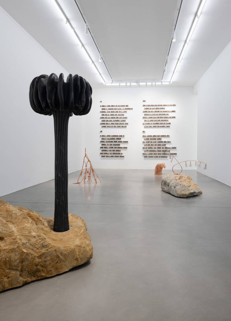 Il concetto di weathering, inteso come resistenza e trasformazione, costituisce il fulcro della mostra. Damiani lavora con materiali che portano in sé la memoria del tempo: marmo, travertino, rame e bronzo si trasformano in forme che richiamano strutture vegetali, cellulari e fossili. Questi elementi si intrecciano per rivelare l’interconnessione tra vita e non-vita, tra evoluzione naturale e azione del tempo. I materiali, modellati nei millenni da processi geologici, diventano protagonisti attivi di un racconto che attraversa decadenza, resilienza e mutamento.