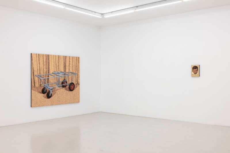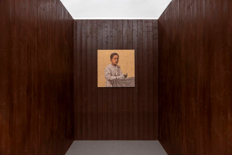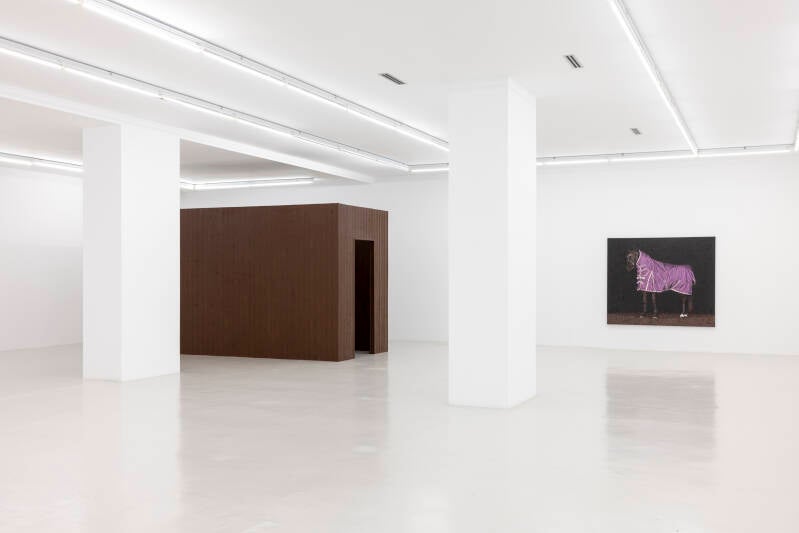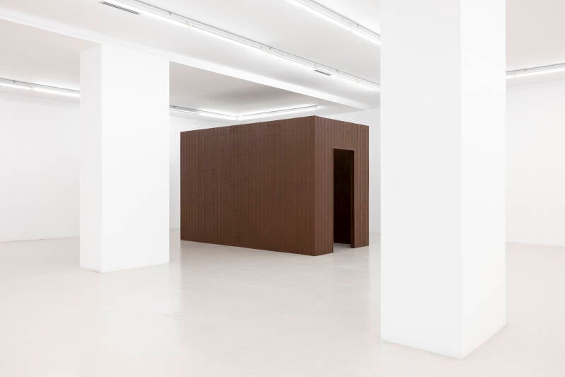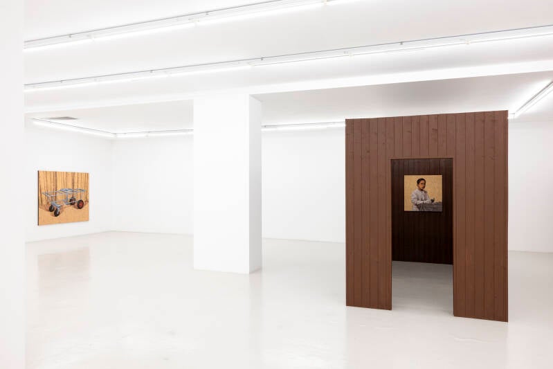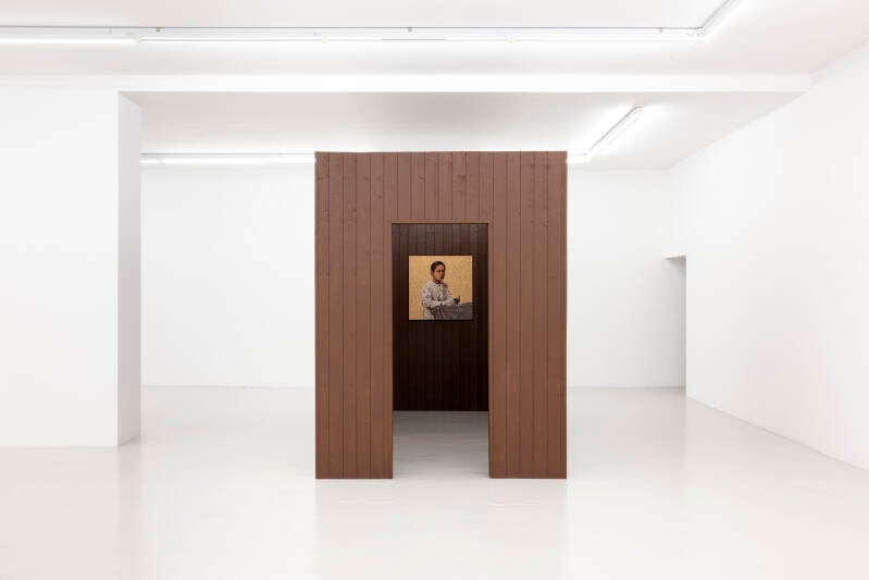 All’ingresso dello spazio di Cassina Projects, una scultura architettonica impone subito la propria presenza: una struttura di legno scuro costruita in situ, che emerge dal candore di pareti e colonne, creando una stanza nella stanza. Più che un'anticamera, è una soglia: non luogo di passaggio ma corpo compatto, abitato da suggestioni familiari e stratificazioni emotive. All'interno, un unico dipinto accoglie il visitatore, come un fulcro di senso in un ambiente sospeso.