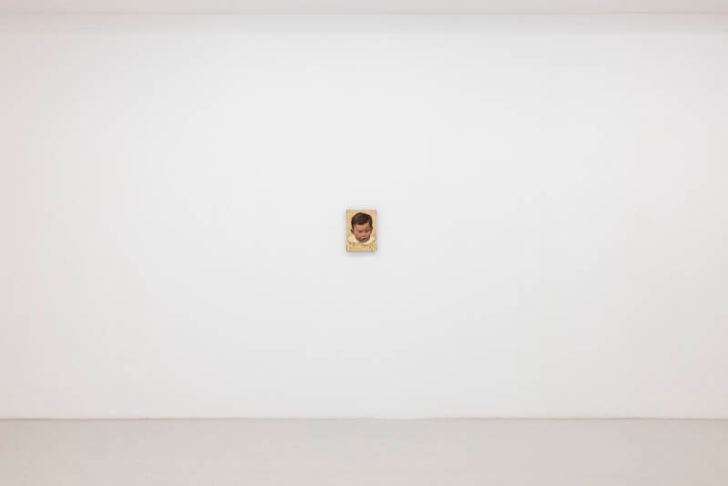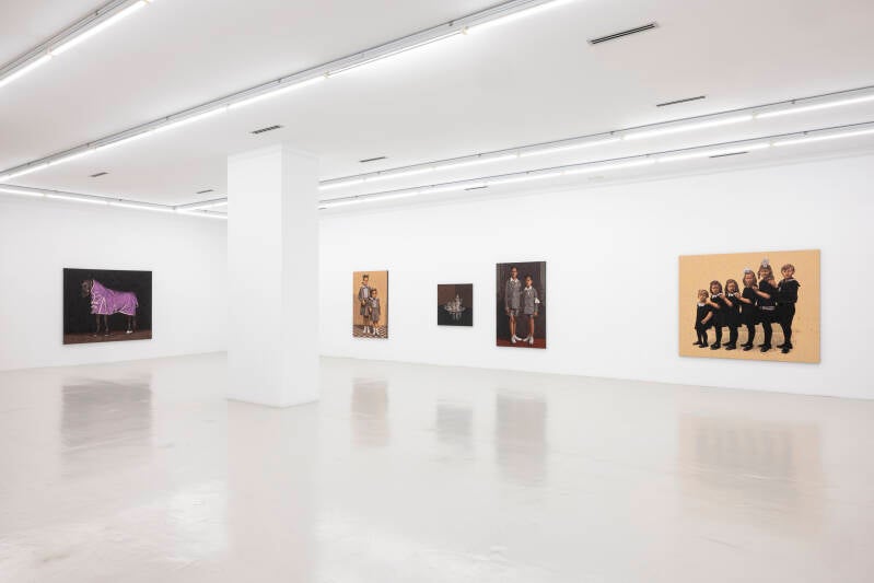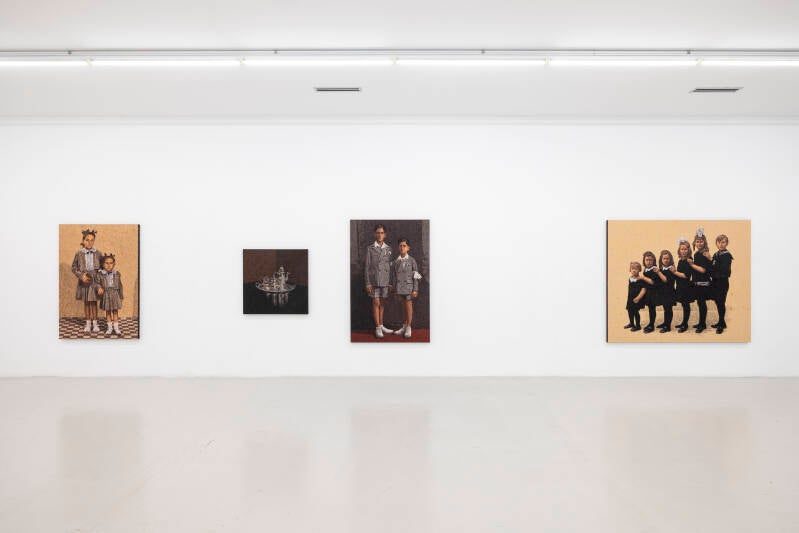 I lavori pittorici di Spina si estendono poi sulle pareti della galleria, evocando mondi in bilico tra storia e visione. Le immagini, tratte da archivi fotografici, appaiono tenue, silenziose, quasi trattenute in un tempo fermo. Bambini in uniforme del dopoguerra, argenterie, paramenti equestri: ogni soggetto è portatore di un’eco, di un potere sottile e stratificato. La pittura di Spina non documenta, ma reinterpreta, indagando il ruolo della rappresentazione nel consolidamento di strutture educative, familiari e sociali.