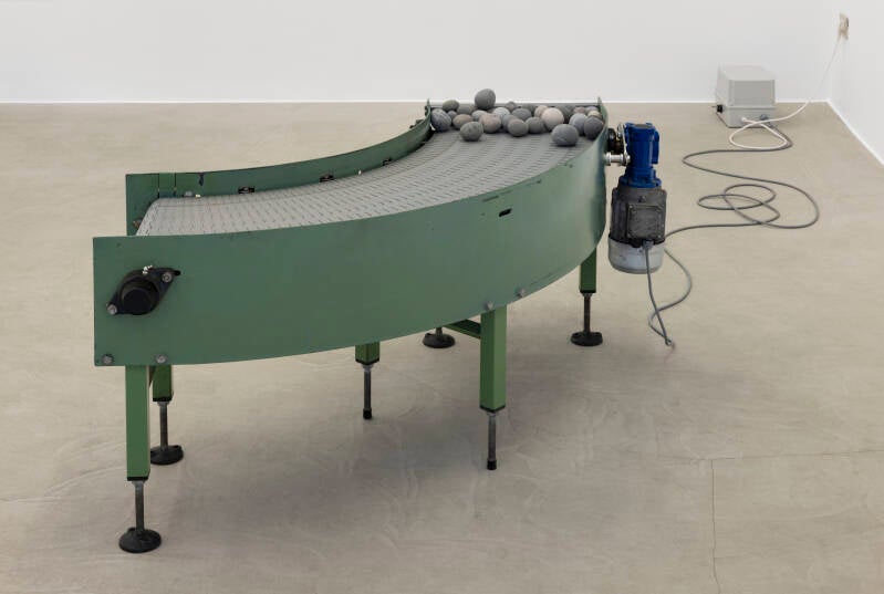 Nina Canell, Murmur, 2025, modified conveyor belt, rocks, 125 x 115 x 61 cm / 49.3 x 45.2 x 24 in
