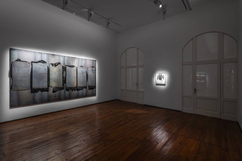 Veduta della mostra KOUNELLIS | WARHOL. La messa in scena della tragedia umana, Galleria Fumagalli, Milano, 2025. Foto Guido Rizzuti. Courtesy Galleria Fumagalli
