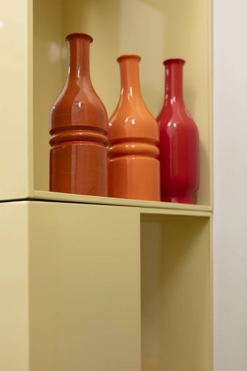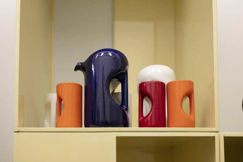 Molti dei pezzi sembrano usciti da un immaginario space age: semisfere perfette, gole circolari, basi che sembrano atterrate da una navicella. E tuttavia tutto rimane incredibilmente terreno. Sarà il gres, saranno gli smalti pieni – l’arancione così deciso, il blu oltremare, il nero lucido – ma c’è una fisicità che riporta alla mano, alla materia che ancora odora di forno, di tornio, di officina.